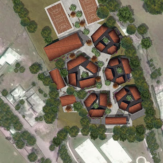 No podrían contrastar más las formas puras del Cubo con las plantas poligonales y cubiertas inclinadas de las nuevas oficinas administrativas del Ayuntamiento de Aculco. Sin embargo, este conjunto muestra al igual que aquél la intención de integrarse al ambiente urbano del lugar, si bien por vías notablemente distintas. En este caso, estamos hablando de una serie de pequeños edificios de un solo nivel y de planta generalmente trapezoidal, cubiertos de teja, que forman bloques alrededor de patios, separados por callejones y espacios abiertos. La inspiración, como resulta evidente, parte del lugar común del aspecto de un pueblito colonial pintoresco con tejados, calles irregulares y plazas, simplificado en formas geométricas en las que la línea recta está casi ausente tanto en las plantas como en las cubiertas.